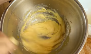 Do hluboké mísy nasypejte cukr, přidejte k němu máslo rozkrájené na kostičky a metličkou obě přísady smíchejte, dokud se obě přísady úplně nespojí a nezískáte hutnou cukernatou hmotu. Vyklepněte dvě vajíčka, oddělte bílky od žloutků, přičemž žloutky přidejte do mísy s oslazeným máslem. Metličkou smíchejte do hladké konzistence.
