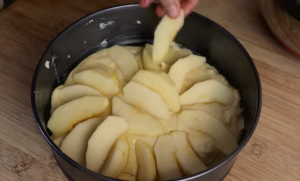 Zapněte troubu, aby se rozehřála na 180 °C a připravte si kulatou dortovou formu, jejíž dno i stěny bohatě potřete máslem. Omyjte a osušte tři jablka, rozkrojte je a vyjměte z nich jadřince. Oloupejte také slupku a čistou dužninu rozkrájejte na tenké půlměsíčky. Na dno dortové formy vyskládejte několik měsíčků jablek a přidejte na ně vrstvu těsta, kterou rovnoměrně rozetřete do formy. Na něj opět vyskládejte vrstvu jablek, tentokráte mnohem hustší než tu první a vložte koláč do trouby.