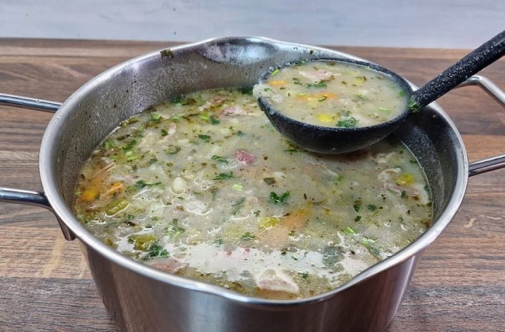 Pak nakrájejte klobásu na kostičky a přidejte ji do pánve k ostatním surovinám. Nasekejte čerstvý tymián a česnek najemno a dejte do pánve. Vzápětí přidejte i sůl, pepř, sušenou petrželku a oregano a 3 minuty smažte. Během toho mírně rozšťouchejte brambory v hrnci s vodou, ale ne na kaši. Následně do hrnce dejte vše z pánve a vařte 10 minut. Před dokončením ještě do polévky dejte trochu nasekané petrželky a můžete servírovat.