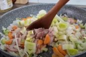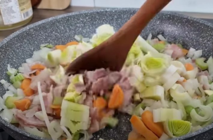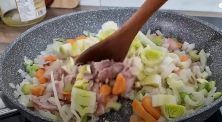 Brambory nakrájejte a dejte je vařit v 1,5 litru vody. Po 15 minutách vaření odstraňte všechnu pěnu a pokračujte ve vaření. Mezitím si nakrájejte slaninu a dejte ji smažit na trošce oleje. Pak přidejte dvě nadrobno nakrájené cibule, nadrobno nakrájený řapíkatý celer, poté nakrájenou mrkev, pórek a 5 minut vše restujte.