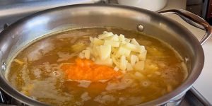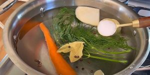 Mezitím připravte zeleninu na vývar. Očistěte mrkev, cibuli, česnek i celer, vložte je do hrnce spolu s natí kopru nebo petržele, bobkovým listem a zrny černého pepře. Přidejte trochu soli a zalijte litrem vody. Na středním ohni vařte nejméně 1 hodinu.