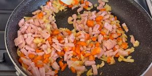 Očistěte druhou mrkev a cibuli a obojí nakrájejte na jemné kostičky. Měkký salám zbavte střívka a nakrájejte ho na malé kousky. Na sporáku rozehřejte pánev se dvěma lžícemi másla a orestujte na něm cibuli. Když začne zlátnout, přidejte k ní mrkev a pokračujte v restování. Nakonec přidejte salám a společně ještě několik minut restujte.