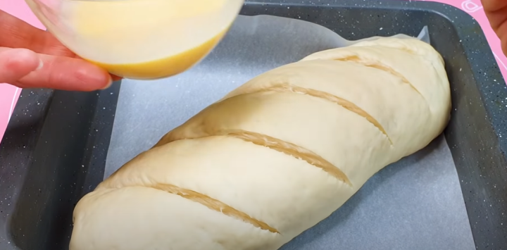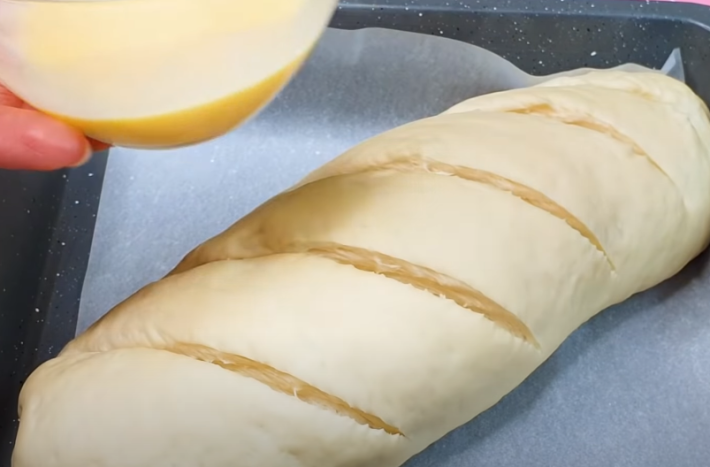 Okraje dobře utěsněte a polotovar pečiva umístěte na plech s pečícím papírem. Nyní si v hrníčku rozmíchejte mléko spolu s rozšlehaným vejcem a směsí těsto po celé ploše potřete. Nakonec ještě pomocí ostrého nože nebo žiletky udělejte na povrchu několik zářezů. Chléb posypte dle chuti sezamovými semínky a dejte péct do předehřáté trouby na cca 25 minut při teplotě 200 °C. Pečivo by mělo krásně zezlátnout.