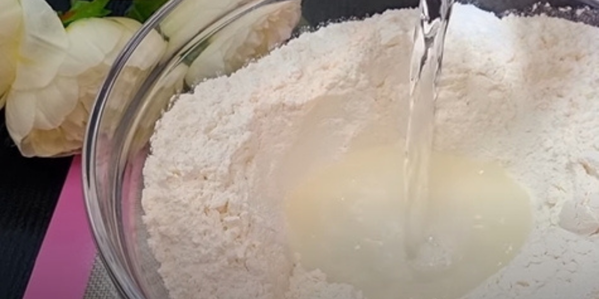 Do mísy prosejte hladkou mouku, abyste ji zbavili zatvrdlých hrudek a přidejte lžíci soli. Důkladně promíchejte a doprostřed vyhlubte jamku, do níž nalijte do ní studenou vodu.