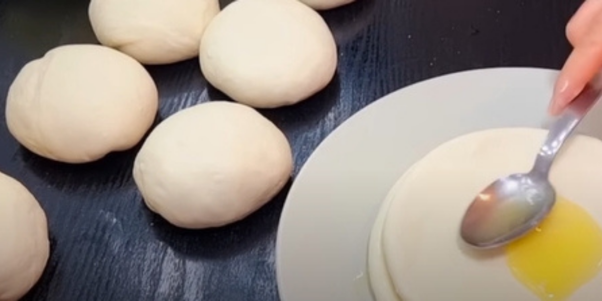 Vezměte jednu kouli a vyválejte ji na ne příliš tenkou placku zhruba o průměru talíře. Přeneste ji na talíř či podnos a celý povrch těsta potřete směsí rozpuštěného másla s olejem.