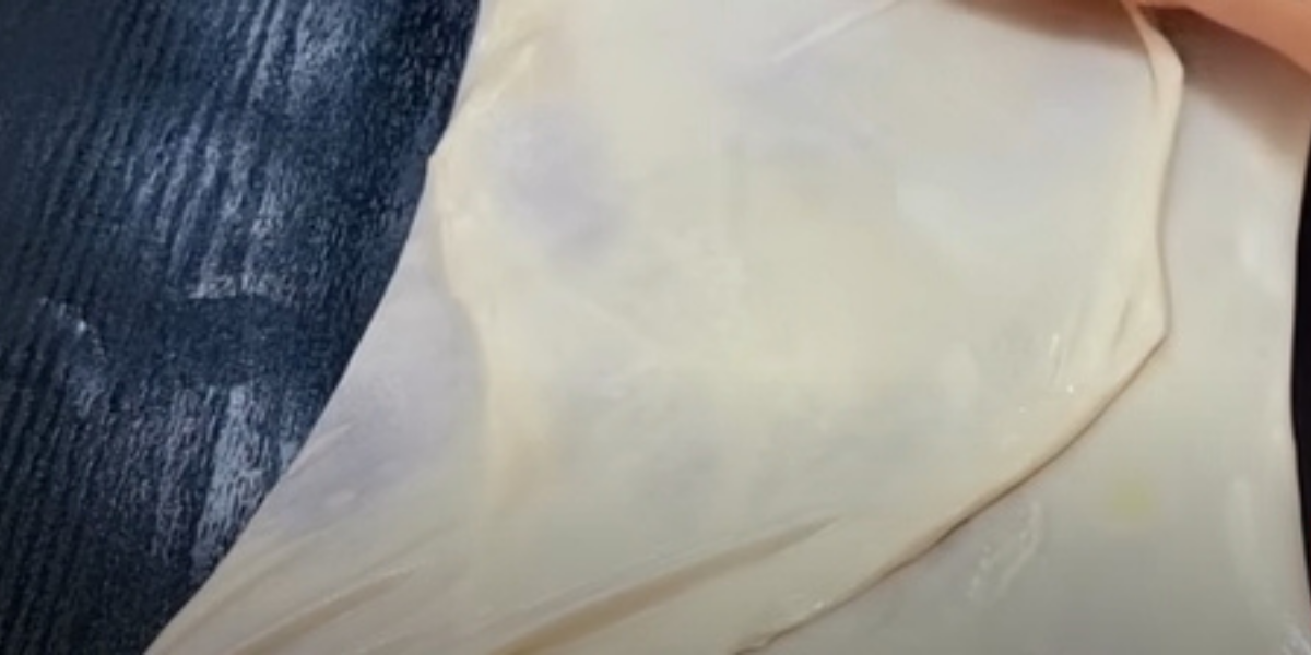 Po čtvrthodině vezměte jednu z placek a rukama ji na pracovní ploše roztáhněte do velmi tenkého plátu, z něhož vytvořte čtverec tak, že překládáte strany plátu do středu.