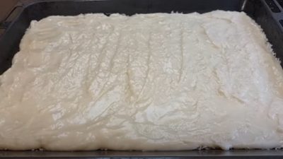 Směs vařte 3–4 minuty, do zhoustnutí a poté do ní vmíchejte máslo s vanilkovým cukrem. Vzniklou hmotou ihned pokryjte kokos na plechu, který vložte do lednice, dokud jeho obsah nevychladne.