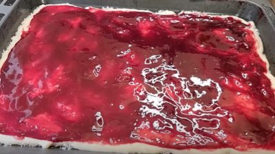 Mezitím připravte třešňovou náplň. Do rendlíku vsypte mražené třešně, které zahřívejte 2–3 minuty. Poté je sceďte a šťávu vraťte zpět do rendlíku, kde ji smíchejte s kukuřičným škrobem, moukou a cukrem.