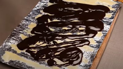 Připravte si alobal, který mírně pomačkejte a zase vyrovnejte a položte na rovnou plochu, s kterou lze snadno manipulovat. Bílou čokoládu rozpusťte a polijte jí alobal. Stejný postup opakujte také s hořkou čokoládou.