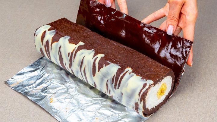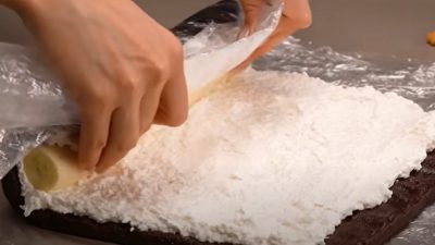 Na jeden okraj těsta položte oloupané banány a těsto zarolujte. Roládu obalte potravinovou fólií a vložte ji na 40 minut do lednice. Mezitím připravte čokoládovou směs na obalení rolády.