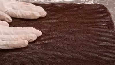 Sušenky rozmixujte na jemný prášek, který smíchejte s rozpuštěným máslem. Jakmile se ingredience propojí, přidejte Nutellu s mlékem a vytvořte těsto, které rozprostřete na potravinovou fólii tak, abyste vytvořili tvar obdélníku o výšce 0,5–1 cm.