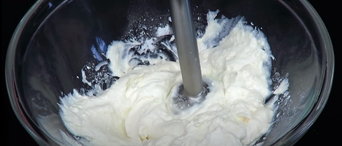 Přidejte druhou špetku soli a přilijte trochu studené (čerstvě z ledničky) plnotučné smetany a dále mixujte či šlehejte do hladka.