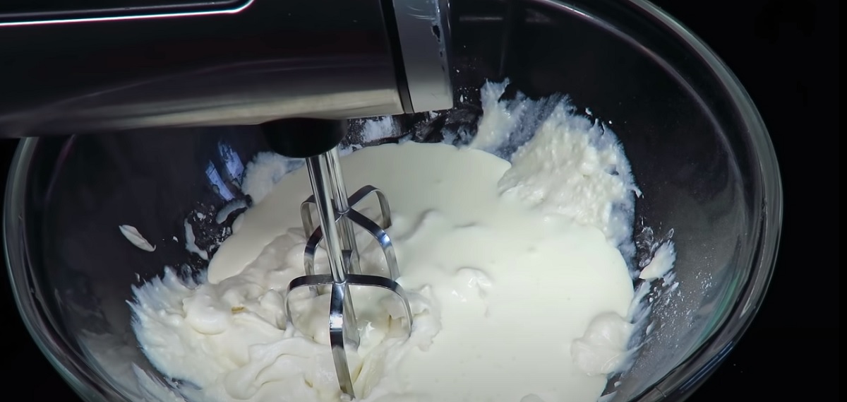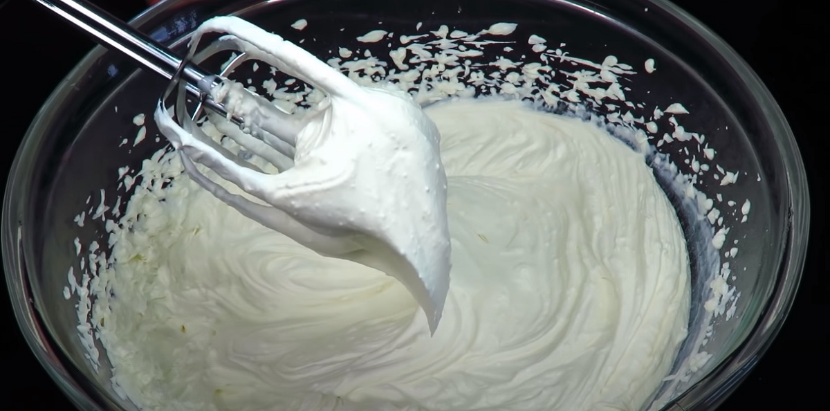 Přilijte i zbytek šlehačky a pokračujte ve šlehání, dokud nezískáte pevnou pěnu, která po vytažení metliček zanechává soudržné špičky.