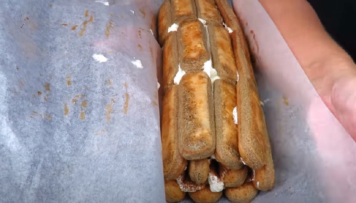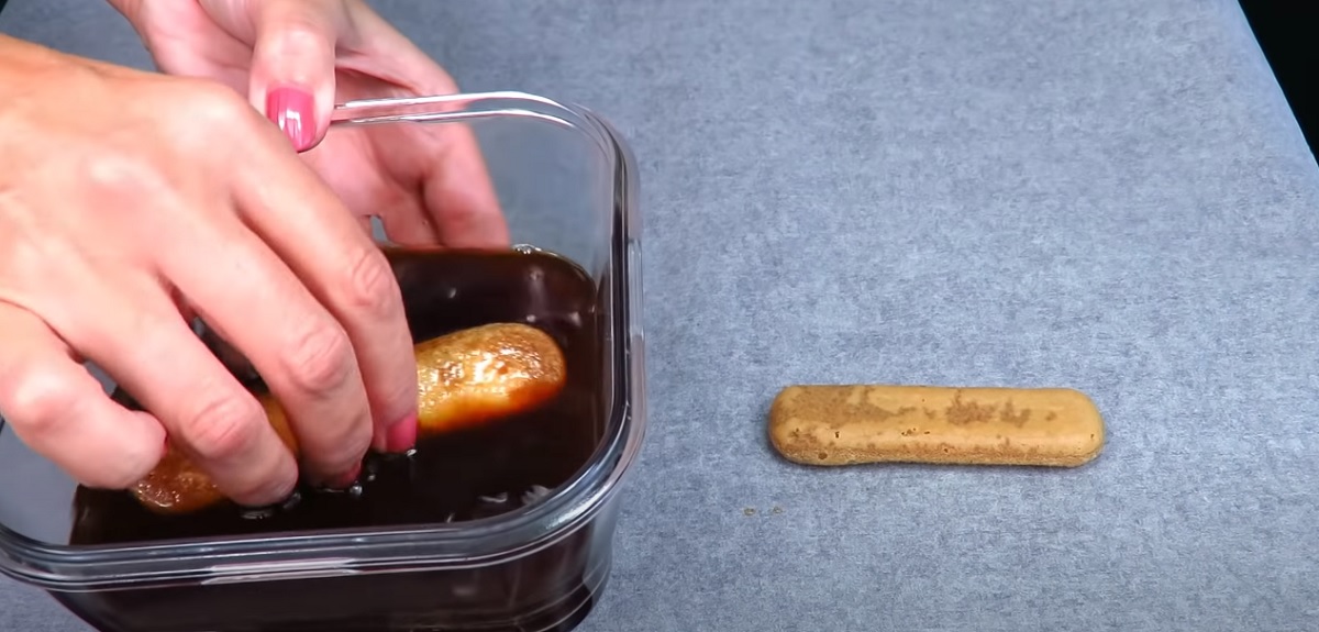 Každý piškot namočte do kávy a položte ho na pečicí papír tak, aby dohromady tvořili velký obdélník ve třech řadách po deseti kusech (měly by ležet pocukrovanou stranou dolů).
