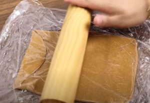 Z náplně udělejte váleček a dejte ji po celé délce na sušenkový obdélník. Pak vše za pomoci fólie srolujte a hotovou rolku poválejte rukama na pracovní desce, aby se spoj těsta nerozbaloval. Proces zopakujte se zbytkem těsta a náplně. Hotové rolky dejte na několik minut do lednice.