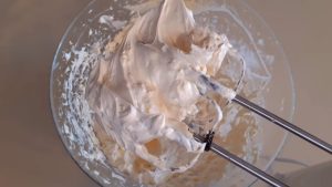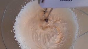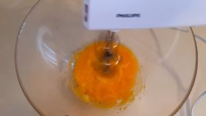 Vyklepněte šest vajíček, oddělte bílky od žloutků, přičemž žloutky vložte do hluboké mísy a bílky odložte do lednice na příští použití do jiných receptů. Ke žloutkům v misce přidejte jednu lžičku cukru a šlehejte je elektrickým šlehačem na nejvyšší otáčky, dokud nezískají světle žlutou barvu.