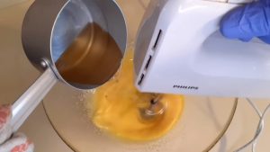 Do rendlíku nasypejte 200 gramů cukru a přilijte k němu jednu sklenici vody. Postavte rendlík na kamna a směs přiveďte k varu. Nechte ji vřít přesně tři minuty, aniž byste cokoliv míchali (cukr se sám rozpustí i bez vašeho zásahu) a odstavte z kamen. Cukrový sirup pak zapracujte za stálého šlehání elektrickým šlehačem do žloutkové směsi.