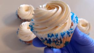 Na cukrářský sáček nasaďte ozdobnou špičku. Do formy na muffiny vyskládejte papírové košíčky a ze zdobicího pytlíku do nich vytlačte troch krému tak, abyste vytvořili ozdobnou čepici. Hotové košíčky můžete posypat některým druhem krásného cukrářského zdobení (skvěle vypadá barevná rýže či hvězdičky z jedlého papíru), nechte vychladit a podávejte.