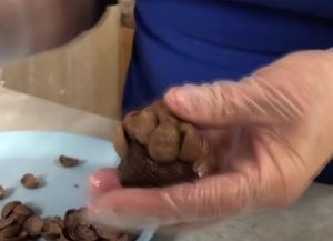 Z těsta odeberte kus o váze 25 až 30 gramů. Vytvarujte ho do mírného kužele se zaoblenou špičkou a placatým dnem. Pokud je těsto moc měkké, můžete ho dát na chvíli do lednice. Poté si vezměte snídaňové čokoládové lupínky a ozdobte jimi kužel od špičky směrem dolů do tvaru šišky (viz video).