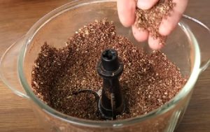 Do mističek dejte sušené meruňky a rozinky. Zalijte je horkou vodou a nechte 10 minut stát. Do mixéru vsypejte vlašské ořechy, dýňová semínka, kokos, sezamová semínka a kakao. Vše rozmixujte na sypkou hmotu.
