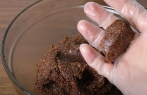 Do mixéru k ní pak přidejte rozinky, meruňky, med a sůl. Umixujte tuhou hmotu a dejte ji do mísy. Pak nalámejte do mixéru křehké sušenky bez cukru a rozmixujte je na prášek. Přidejte ji do mísy a všechny suroviny důkladně propracujte rukama na soudržné těsto.