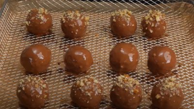 Nepečené ořechové kuličky posypte nasekanými vlašskými ořechy a vložte je do lednice na 10–15 minut.