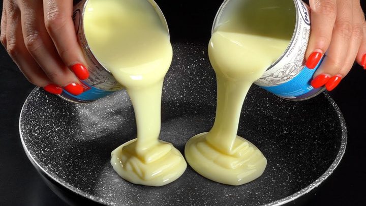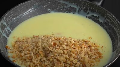 Kondenzované mléko vlijte do pánve a zahřívejte ho 1 minutu. Poté do něj vmíchejte nasekané vlašské ořechy a pokračujte ve vaření další 2–3 minuty, dokud těsto nezhoustne.