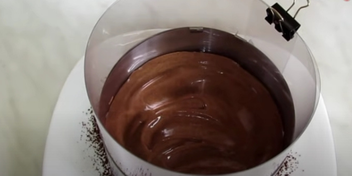 Po uplynutí hodiny vyndejte dort z lednice, odstraňte dortový kroužek i acetátovou fólii a hotový dort zasypejte přes sítko kakaem.