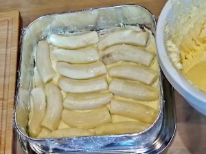 Oloupejte banány a podélně i příčně je rozkrojte na poloviny, které vložte do misky a polijte je citronovou šťávou. Promíchejte je, aby se jí úplně obalily. To jim pomůže zachovat si světlou barvu i po upečení. Poloviny banánů pak vyskládejte po celé ploše krému ve formě. Povrch banánů pak opět pokryjte krémem, který uhlaďte do roviny a na něj vyskládejte druhé patro sušenek.
