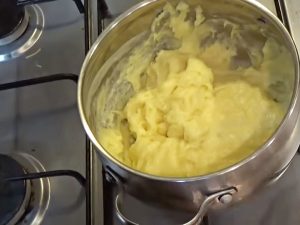 Do mísy vlijte jedno vajíčko a tři samotné žloutky a vyšlehejte je do bělavé pěny spolu s cukrem. Přilijte k nim asi čtvrtinu mléka a přisypejte hladkou mouku a bramborový škrob a vše do sebe důkladně zašlehejte. Zbylé mléko nalijte do hrnce a přiveďte ho k varu. Přidejte jednu lžičku vanilkového cukru, a když začne vřít, vlijte do mléka žloutkovou směs. Za stálého míchání na mírném až středním ohni připravte hustý pudink a nechte ho vychladnout.