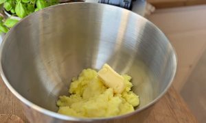 Ke zchladlému pudinku přidejte změklé máslo a ručním šlehačem či robotem obě přísady vyšlehejte do hladké a krémové konzistence.