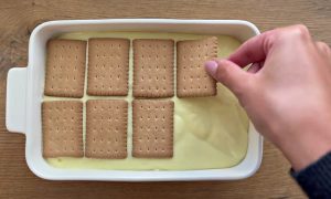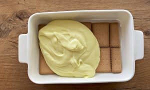 Do obdélníkového plechu nebo zapékací misky o rozměrech 20 x 14 cm vyskládejte souvislou vrstvu obdélníkových sušenek a vlijte na něj připravenou pudinkovou směs. Rozetřete ji do rovnoměrné vrstvy a povrch urovnejte do hladké roviny. Poté na ni vyskládejte druhou vrstvu sušenek.