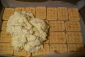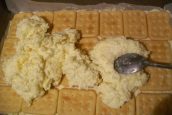 Připravte si vhodný podnos a rozložte na něj obdélníkovou vrstvu sušenek. Na ty pak rozprostřete polovinu vanilkového pudinkového krému. Ten zakryjte druhou sušenkovou vrstvou a na tu navršte zbylou polovinu krému, jehož vrch posypejte mandlovými vločkami.