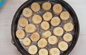 Banány nakrájejte na cca 3 cm dlouhé kousky a vyskládejte je na dno pečicí formy (průměr 22 cm), které vyložte potravinářskou fólií. Do menší misky dejte vanilkový pudink, kakao, cukr, kukuřičný škrob a vše důkladně promíchejte metličkou. Do hrnce nalijte plnotučné mléko, dejte ho na sporák a přisypejte k němu sypkou směs.