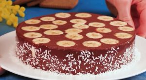 Zarovnejte ji stěrkou nebo cukrářským nožem a nechejte dezert na hodinu v lednici. Poté jej posypejte strouhaným kokosem, obraťte ho vzhůru nohama, sundejte z něj formu a potravinářskou fólii a finálně dozdobte strouhaným kokosem. Poté můžete ihned podávat, dobrou chuť!