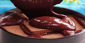 Vmíchejte ji do mléka a za stálého míchání vařte, dokud směs nezhoustne. Pak ji ihned sundejte ze sporáku a bokem ještě promíchejte. Přidejte do ní změklé máslo a opět míchejte, dokud se zcela nerozpustí. Nalijte ji na do formy a trochu náplně ještě nechejte v hrnci. Vyskládejte do formy pár sušenek a ty zalijte zbylou náplní.