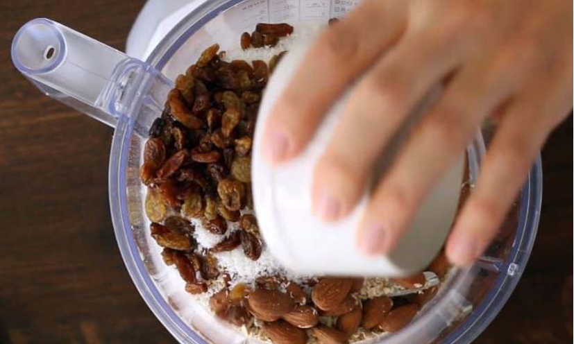 V sekáčku si rozemelte na homogenní hmotu ovesné vločky spolu s rozinkami, mandlemi, kokosem a solí.