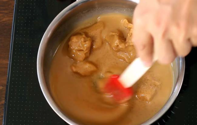 Poté si v rendlíku smíchejte arašídové máslo, med, vanilkovou esenci, kokosový olej a zahřejte na středním plamenu.