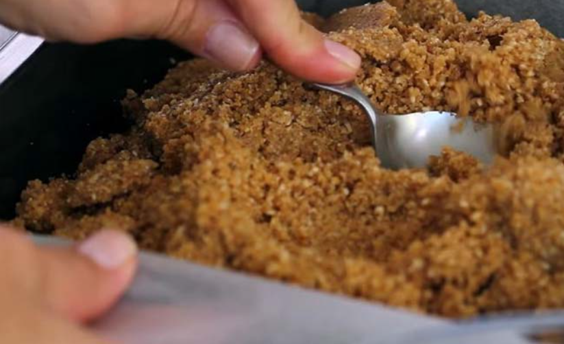 Nyní začněte s kompletací koláče. Do formy navrstvěte ovesnou hmotu a dobře upěchujte lžící.