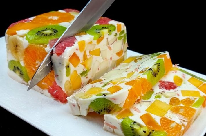 Do mléčné směsi dejte zbylé kousky ovoce a promíchejte. Pak vše nalijte do formy a uhlaďte. Pracujte svižně, agar tuhne rychle. Nechte dezert vychladit v lednici, nakrájejte ho na porce a podávejte.