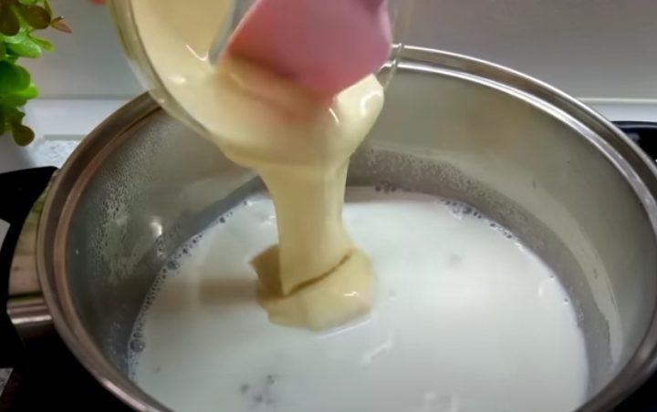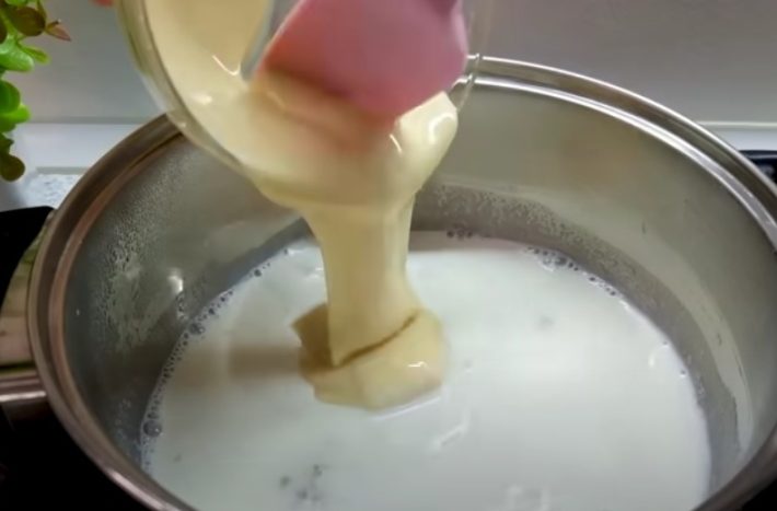 Do skleněné formy o objemu 1,5 litru rozložte na dno a po stěnách část mandarinek a dalšího ovoce (viz video), ostatní si zatím schovejte. Do hrnce dejte agar a vodu, promíchejte a dejte vařit. Pak přilijte mléko a slazené kondenzované mléko a nechte další 2 minuty vařit. Sundejte hrnec ze sporáku, přidejte bílý jogurt nebo zakysanou smetanu a promíchejte.