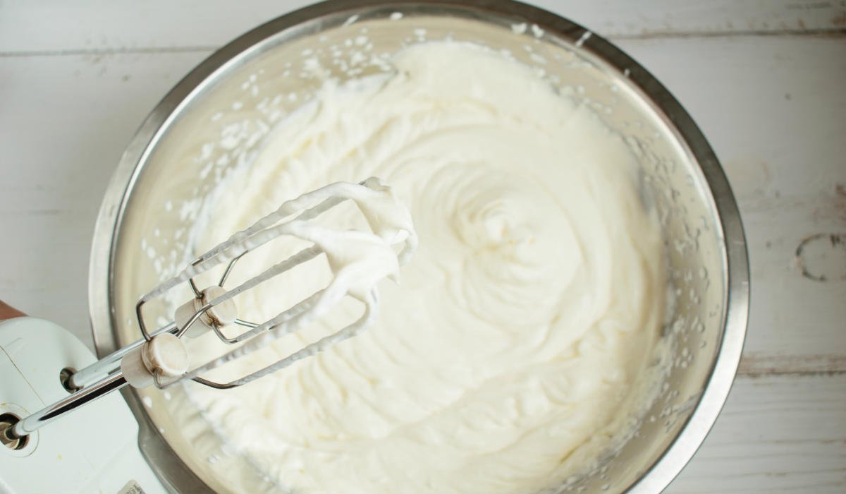 Zakysanou smetanu vylijte do hluboké mísy a přidejte k ní kondenzované mléko. Obojí pak elektrickým šlehačem vyšlehejte do hladké směsi.