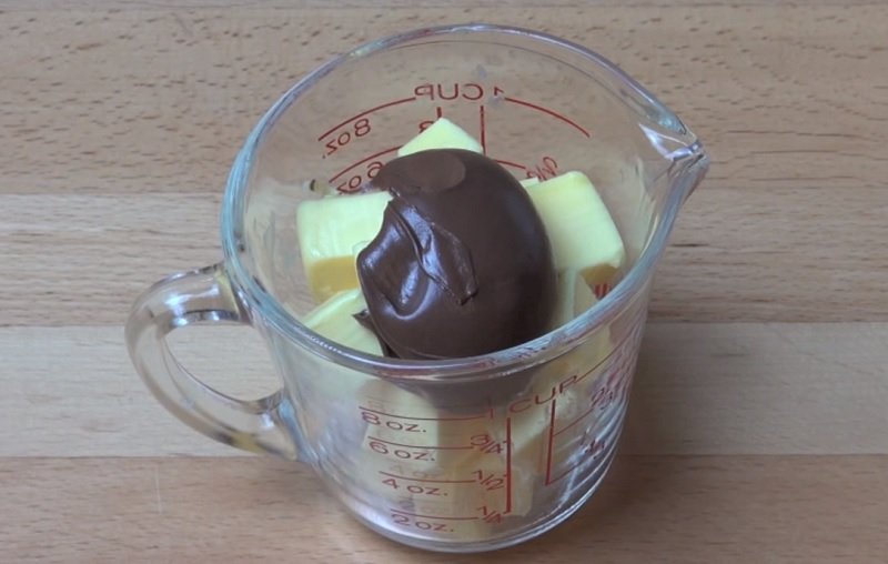 Máslo rozkrájejte na kousky a vložte je do misky vhodné do mikrovlnné trouby. K máslu přidejte jedno nebo dvě lžíce nutelly a nechte v mikrovlnce roztavit.