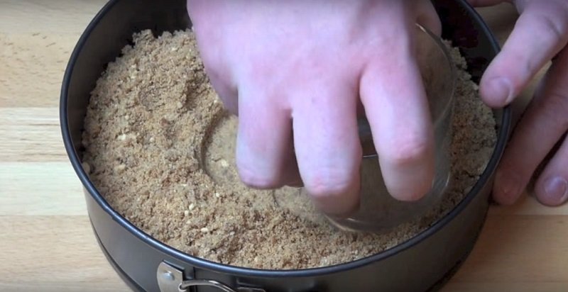 Sušenkovou hmotu vyndejte z lednice ven, připravte si kulatou dortovou formu a sušenkovou hmotu do ní důkladně napěchujte tak, abyste vytvořili jakousi těstovou mističku, kterou následně budete plnit náplní. Dobře to jde dnem pevné kulaté skleničky.