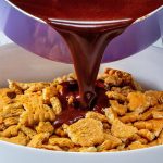 Když má směs strukturu hustějšího kakaa, vezme se hrnec a obsahem se zalijí všechny nalámané sušenky v míse. Následně už stačí směs jenom důkladně promíchat, aby došlo k tomu, že se jednotlivé ingredience propojí a sušenky důkladně nasáknou čokoládový základ.