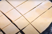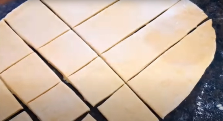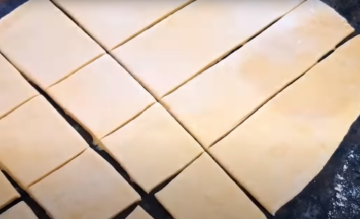 Vykynuté těsto rozválejte na pomoučeném vále pomocí válečku a nakrájejte na čtverce, přibližně stejně velké.