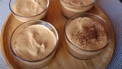 Mezitím připravte pěnu. Cukr vyšlehejte s kávou a horkou vodou. Z ingrediencí vytvořte pěnu, kterou naplňte vychlazené poháry s krémem.