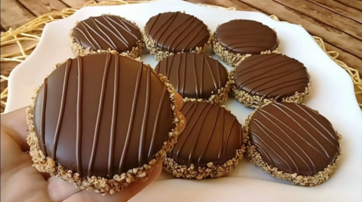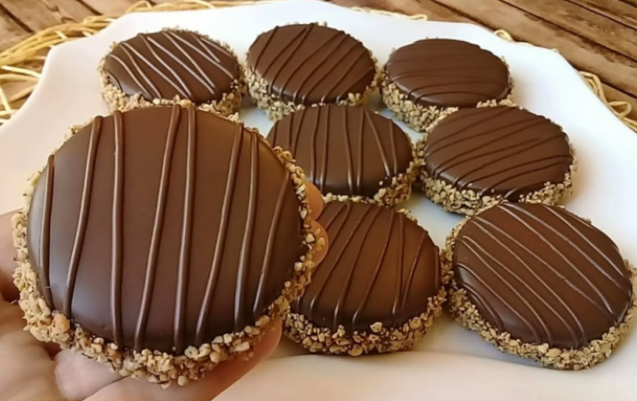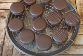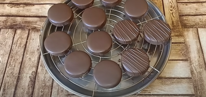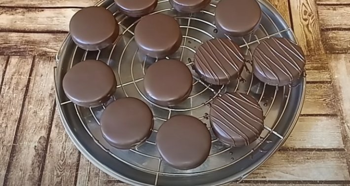 Čokoládou polevu získáte jednoduše tak, že ve vodní lázní necháte rozpustit čokoládu s trochou másla. Slepená kolečka můžete do polevy buďto namáčet nebo jí můžete povrch koleček ozdobit například pomocí zdobicího sáčku.