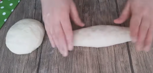 Poté si lehce navlhčete ruce vodou, těsto v míse rukou podeberte a přemístěte ho na lehce pomoučněný vál, kde ho znovu prohněťte a během toho ho zasypejte ještě trochou hladké mouky, kterou zapracujte do těsta. Zformujte z těsta bochníček, který rozdělte na čtyři stejně velké části. Každou z nich prohněťte, rukou rozplácněte na obdélník, který srolujte do válečku a zamačkejte spoj. Bochníček ještě trochu rozválejte a vytvořte šišatý útvar