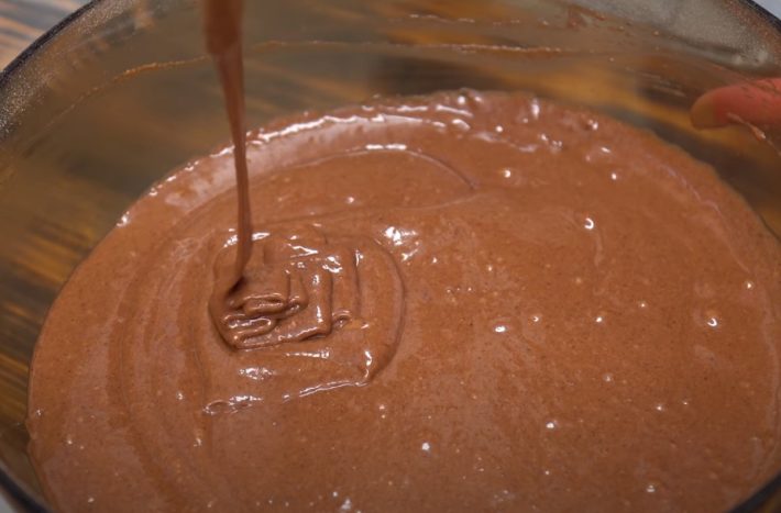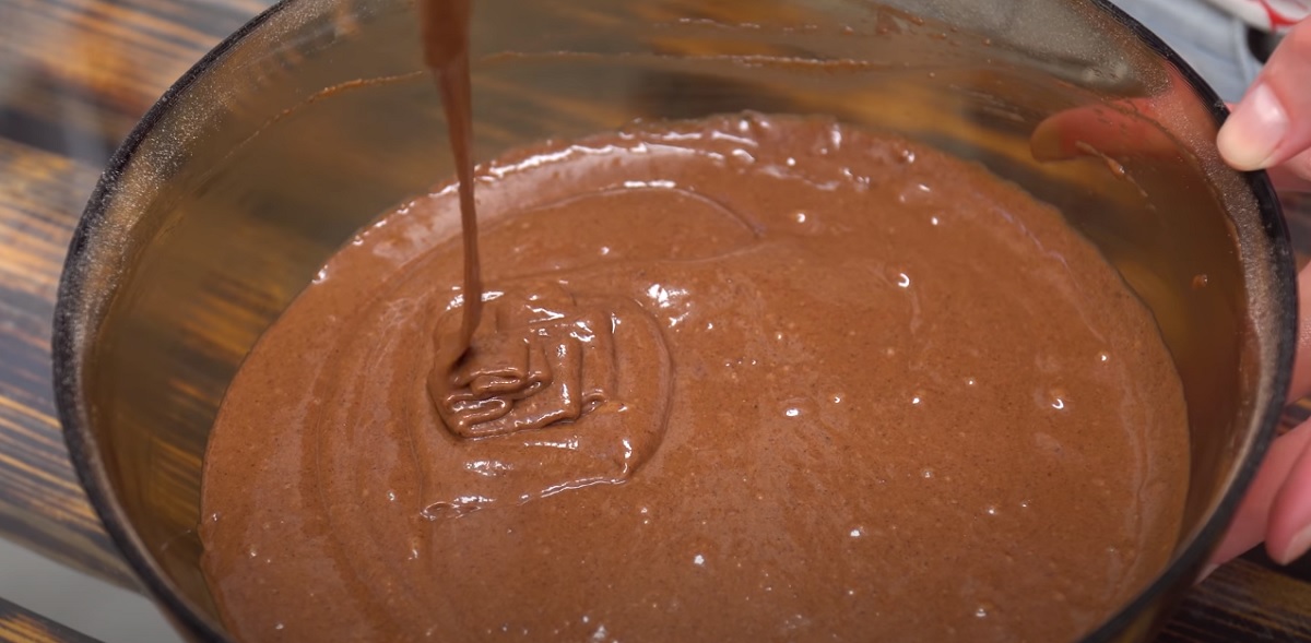Těsto velmi dobře promíchejte, aby v něm nezůstaly hrudky a abyste získali polotekutou konzistenci, kdy těsto stéká ze špachtle v podobě stužky.